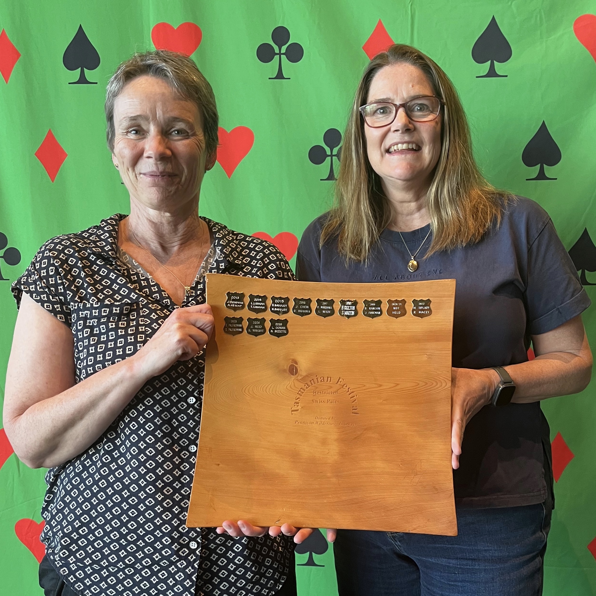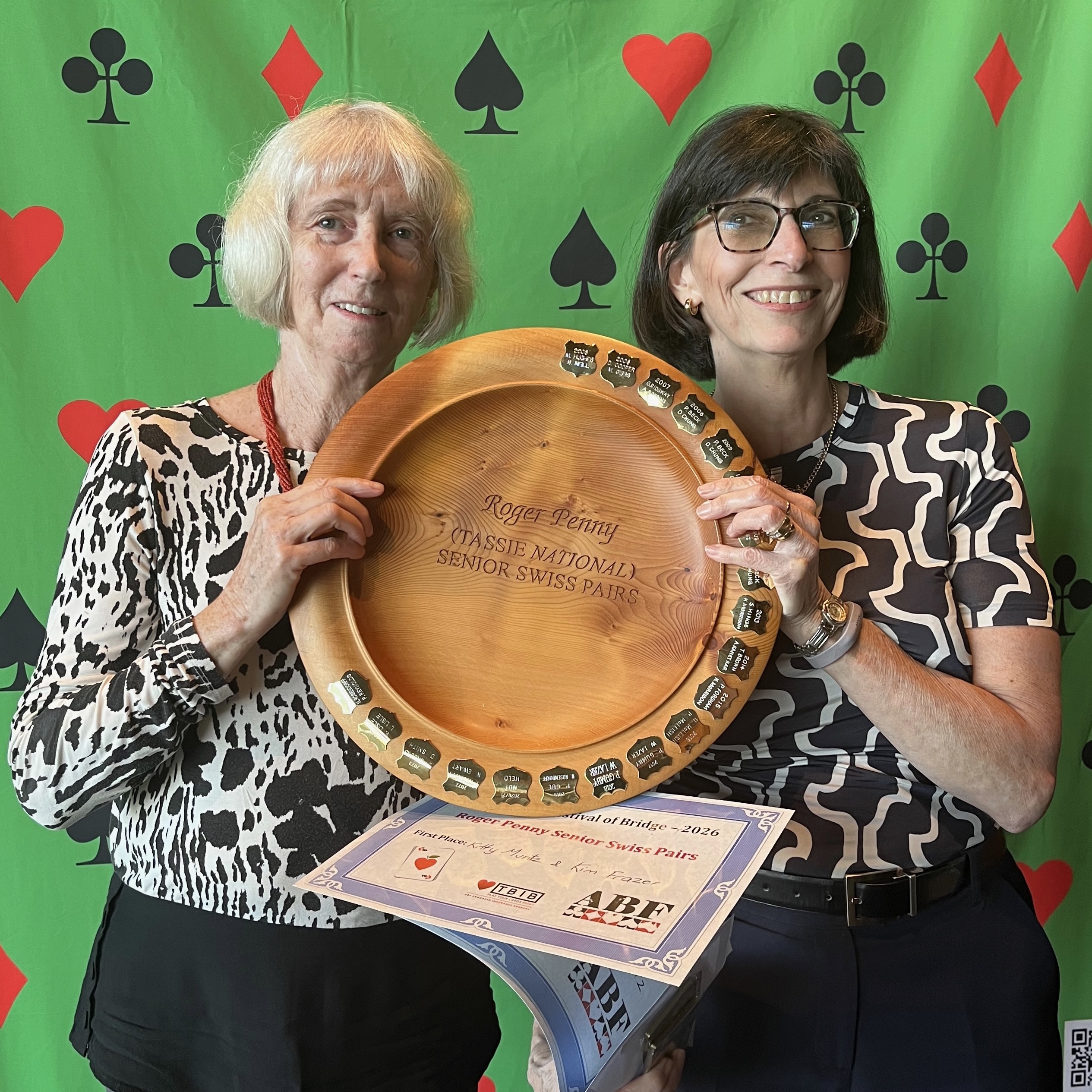 The Roger Penny Senior Swiss Pairs was won by Kitty Muntz and Kim Frazer. George Bilski and Martin Bloom came second. Yolana Floris and Toni Bardo came third. Bal Krishan and Richard Cooke were the highest place Tasmanian Pair.